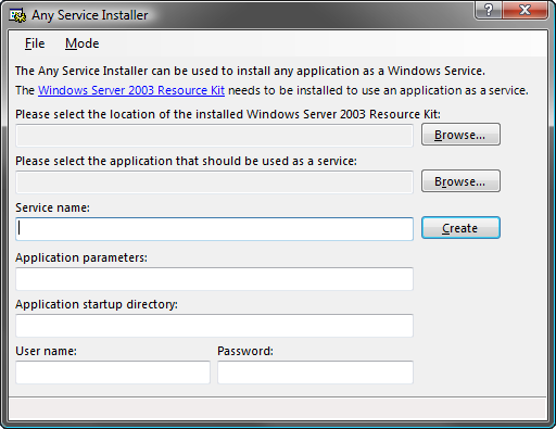 L’outil Srvany (Run any program as a service) contenu dans le pack d’outils de ressources pour Windows 2003 (Windows Ressources Kit Tools) permet la mise en service d’une application. Combiné à AnyServiceInstaller, la manipulation s’en voit simplifiée.